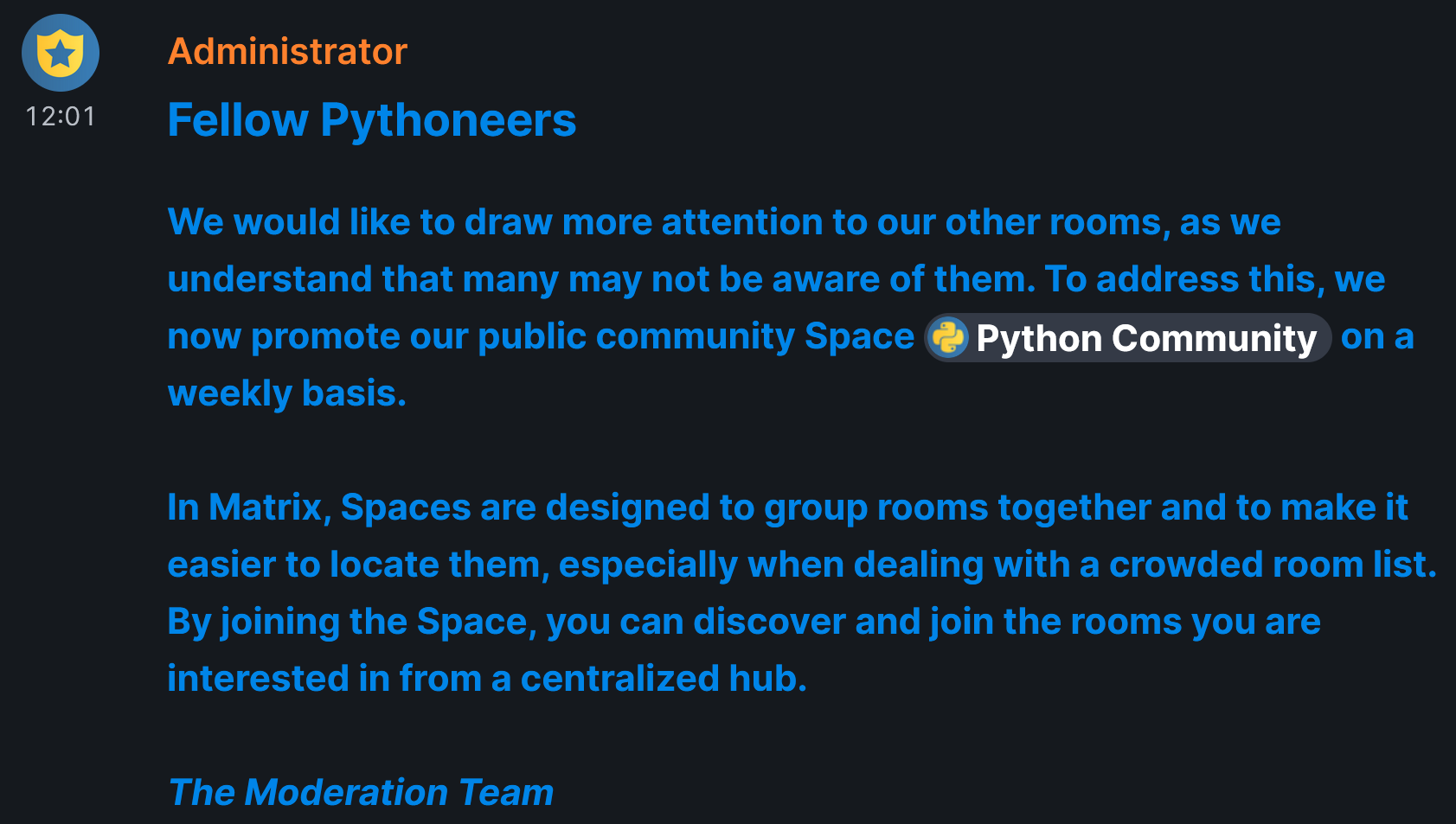 While addressing the main issue may require more drastic changes, like making the space mandatory, which comes with it’s own set of complications, fostering more engagement in the off-topic room should not require such extremes. Promoting the Python community Space alone may not be a complete remedy. Nonetheless, it can serve as a positive step towards improving the overall community experience.