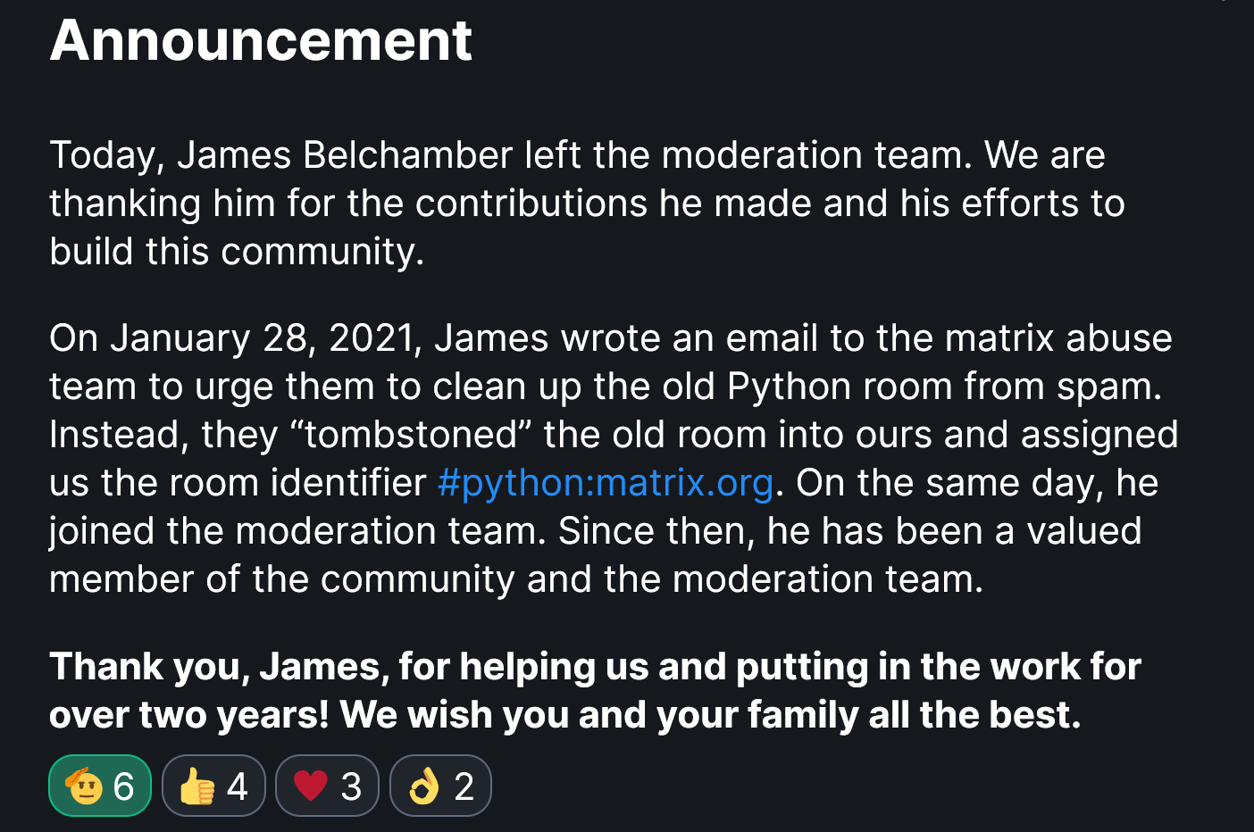 After 881 days or roughly 2 years and 5 months of actively moderating the Python community on matrix, James Belchamber decided to step down as moderator.